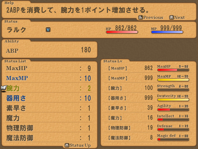 例えば、腕力LVが1の場合、ABPを1消費して、腕力を1ポイント上昇させることができる。