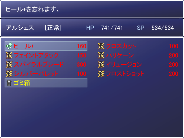 ③・・・1番目にゴミ箱を選択した状態の場合、2番目が選択したスキルを忘れる(消去)