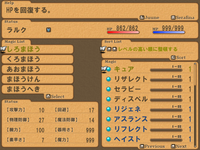 あとは、魔法の分類とか、「C」ボタンを押したら、自動ソートのタイプを選べたりする。